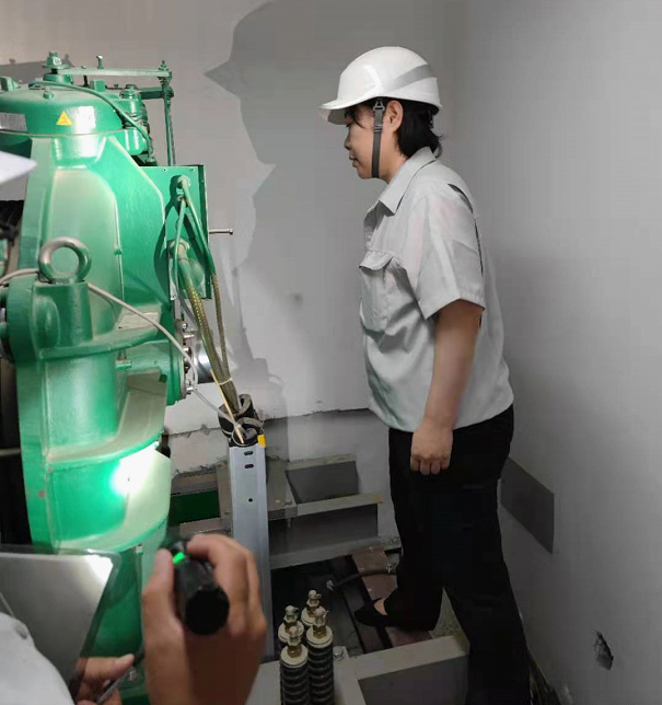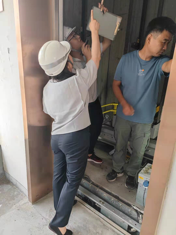 為了保證工作扎實開展,鼓勵一線員工,7月30日,院公司王楠楠副總經(jīng)理到達現(xiàn)場帶班檢驗。從資料審查開始,檢照明、試通話、進機房、查井道、看底坑,帶班參與了全過程檢驗。檢驗過程中,王總還仔細了解了有關(guān)檢驗程序和技術(shù)要求,親自查看了曳引機、限速器等運行和動作情況,參與了鋼絲繩、轎頂、底坑、轎底等部位的檢驗。